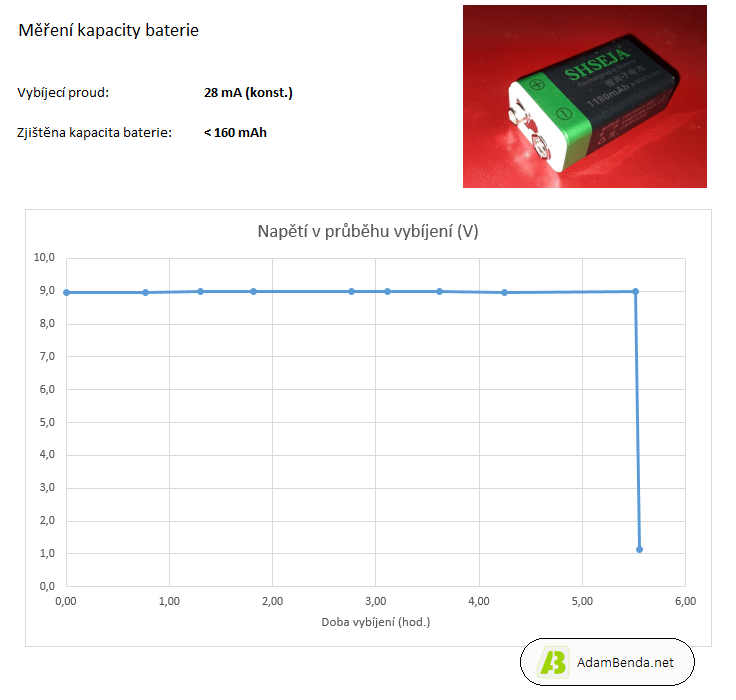 Na baterii označené SHSEJA je uvedena kapacita 1180 mAh. Změřená kapacita je však zhruba 10x menší, a to přibližně 160 mAh.